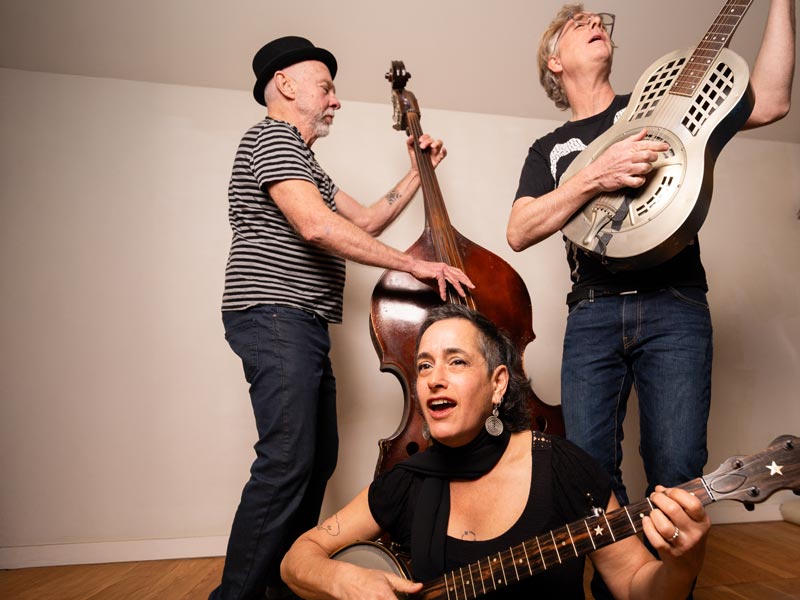 Considered one of the country’s most inviting square dance callers, Evie has over 300 clawhammer banjo students on Peghead Nation, hosts regular workshops in Old-time harmony singing, and is an ace flatfoot clogger. Bass player Keith Terry brings a deep groove to his tonal percussion, is a pioneer in contemporary Body Music, and is the founder of the International Body Music Festival. Guitarist Erik Pearson adds just the right spice with tasty solos. He plays with cinematic Old-time band The Crooked Jades and storyteller Diane Ferlatte. Together, the trio delivers soulful, exciting concerts that will move you to laugh and cry.