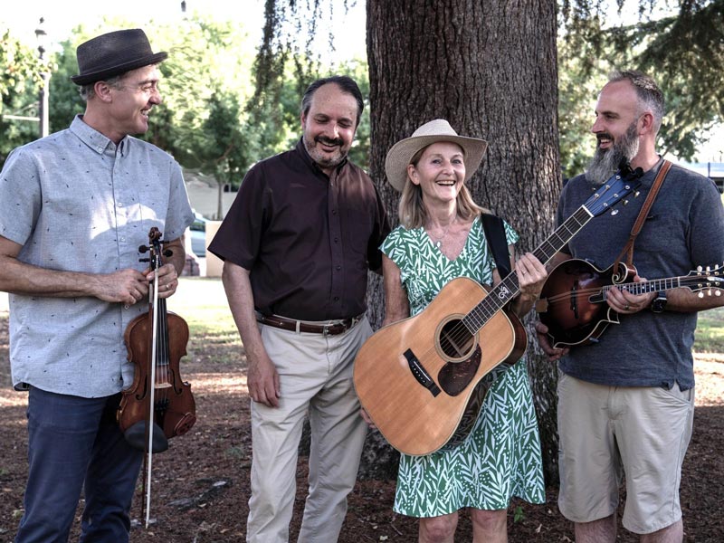 Silver City originated in the D.C. area, where the band had a popular ten-year run and released their first CD, Somewhere in These Hills. The California version of the band has been taking the stage in Northern California since 2023. Their new EP, Train at the Station, was released in August 2025 and is available on popular streaming platforms. Leta Simons (guitar, vocals): When Leta was twelve years old, her mother pulled out an old guitar from the closet and strummed a few chords. Leta took it from there and has been singing and playing ever since. She honed her songwriting skills in Nashville, where she was a featured singer/songwriter at writer’s nights in the round. Leta was living in Alaska when she met bass player and future husband Dan Pollak. In her new hometown of Folsom, she spends her artistic time playing and writing music and developing the repertoire and arrangements for Silver City. Dan Pollak (bass, vocals): Dan began his music career playing saxophone in jazz ensembles, but his love of bluegrass eventually inspired him to take up the upright bass. A temporary job in Juneau, Alaska, led to the formation of his first string band with Leta in 2008. In addition to Silver City, Dan has played bass in a variety of string bands in D.C. and the Sacramento area, and he still picks up the sax occasionally to play with area jazz ensembles. Giorgi Khokhobashvili (fiddle): Originally from Georgia (the one on another continent), Giorgi moved to Sacramento in 2005 and quickly became an integral part of the Northern California music community. In addition to Silver City, he performs with a variety of bands, including Jazz Gitan, Jessica Malone Band, and The Sky Kings. For his day job, he teaches strings at the Cedar Springs Waldorf School. Tom Shewmake (mandolin): Tom has performed for over 25 years and has shared the stage with Keith Little and Dan Crary. As a teenager, he started his own family band and participated in the CBA’s Kids on Bluegrass program. More recently, he has been seen all around the West Coast as a member of the string band One Button Suit. Tom’s unique style of playing is crafted from a blend of traditional and modern techniques, as heard on his album of original material, Blindside